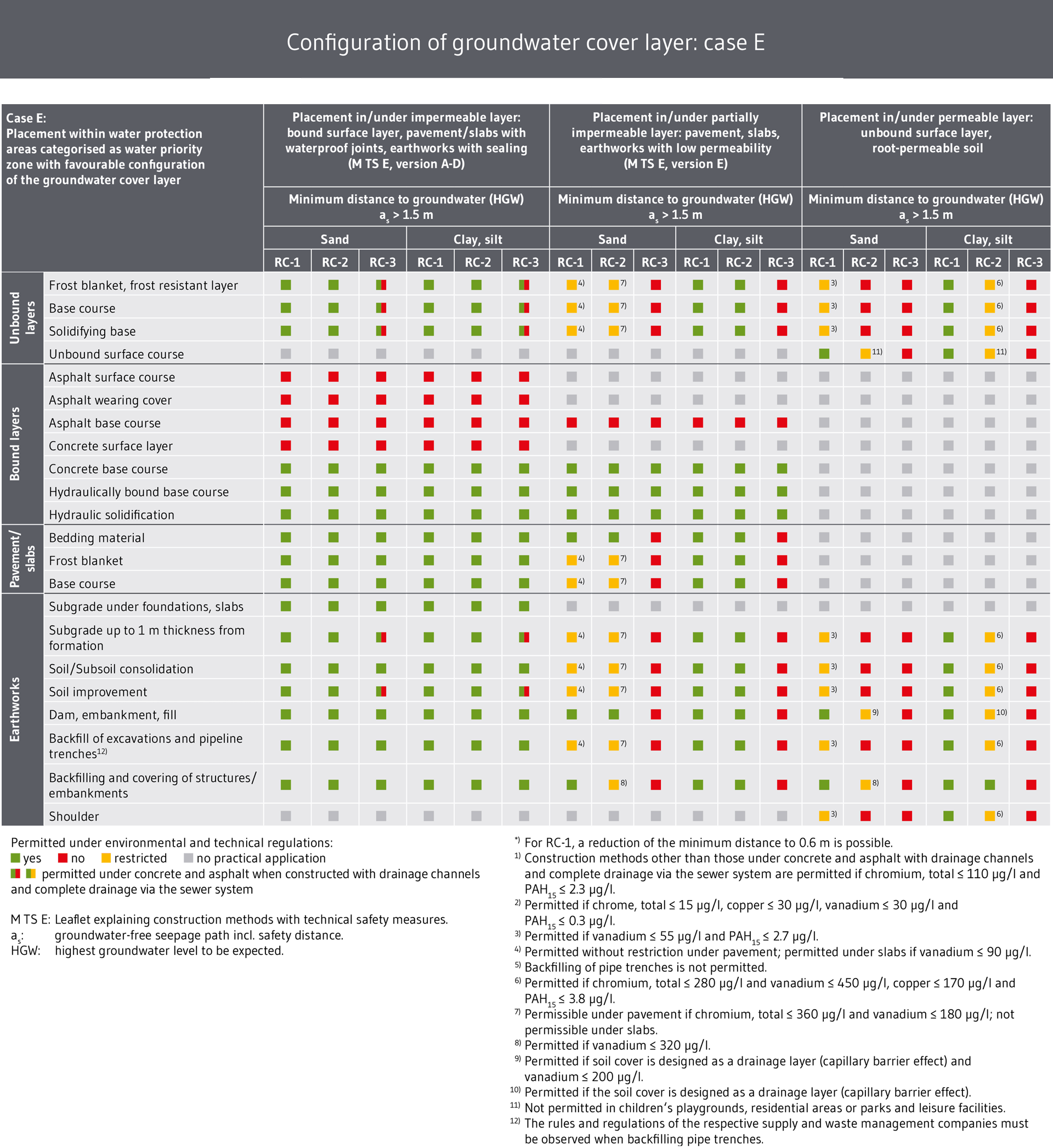 Based on the specifications of the German Secondary Aggregate Directive (EBV) and the regulations of the Road and Transportation Research Association (FGSV), the possible applications for recycled construction materials are summarised on this page. The tables show the areas of application of recycled aggregates in the form of a traffic light system for the material classes RC-1, RC-2 and RC-3 defined according to the EBV. A distinction is made between five cases depending on the local conditions.